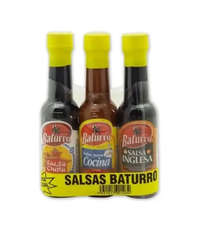 Discover the perfect combination of flavors with the Salsa Baturo Trio, featuring three classic sauces: Chinese sauce, English sauce, and a versatile cooking sauce. Each 5.5oz (163ml) bottle is packed with rich and authentic taste, making it the ultimate addition to your kitchen.